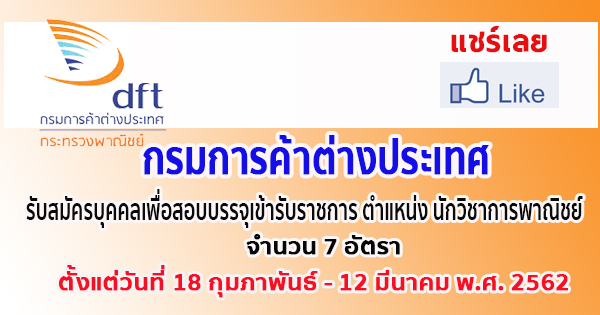 กรมการค้าต่างประเทศ รับสมัครบุคคลเพื่อสอบบรรจุเข้ารับราชการ ตำแหน่ง นักวิชาการพาณิชย์ จำนวน 7 อัตรา ตั้งแต่วันที่ 18 กุมภาพันธ์ - 12 มีนาคม พ.ศ. 2562