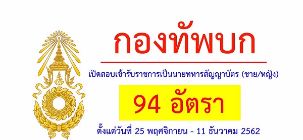 กองทัพบก (ทบ.) เปิดสอบเข้ารับราชการเป็นนายทหารสัญญาบัตร ประจำปี 2563 จำนวน 94 อัตรา รับสมัครทางอินเทอร์เน็ต ตั้งแต่วันที่ 25 พฤศจิกายน - 11 ธันวาคม 2562