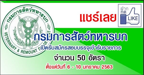 กรมการสัตว์ทหารบก เปิดรับสมัครสอบบรรจุเข้ารับราชการ จำนวน 50 อัตรา รับสมัครด้วยตนเอง ตั้งแต่วันที่ 6 - 10 มกราคม 2563