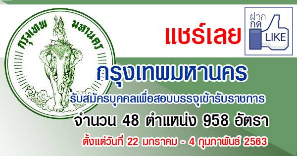 กทม. เปิดรับสมัครสอบเป็นข้าราชการกรุงเทพมหานคร ครั้งที่ 1/2563 จำนวน 958 อัตรา รับสมัครทางอินเทอร์เน็ต ตั้งแต่วันที่ 22 มกราคม - 4 กุมภาพันธ์ 2563