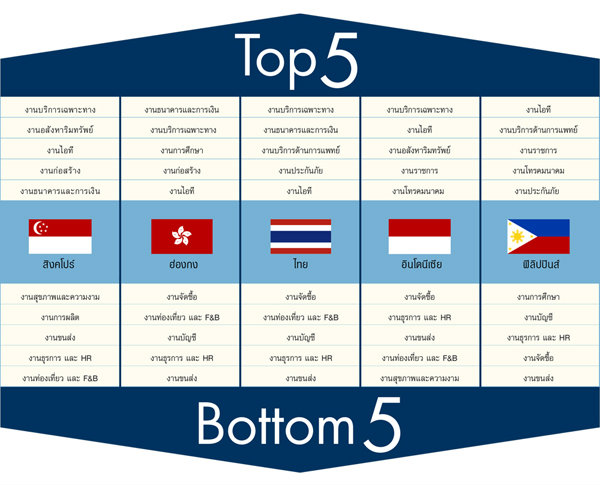 ในขณะที่ ประเภทงานที่ได้รับผลตอบแทนต่ำสุดในภูมิภาค ได้แก่ งานจัดซื้อ งานธุรการและทรัพยากรบุคคล และงานโรงแรมและ F&B