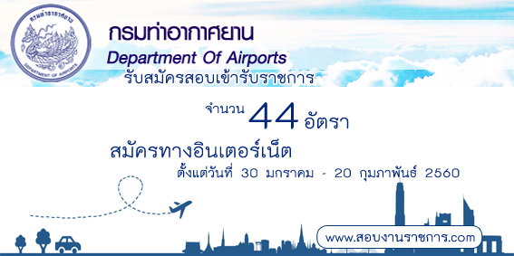 กรมท่าอากาศยาน เปิดรับสมัครสอบเข้ารับราชการ จำนวน 44 อัตรา รับสมัครทางอินเทอร์เน็ต ตั้งแต่วันที่ 30 มกราคม - 20 กุมภาพันธ์ 2560
