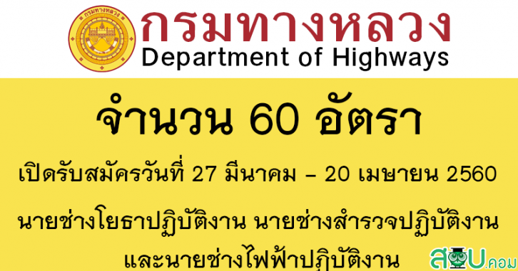 กรมทางหลวง เปิดสมัครสอบเข้ารับราชการ 60 อัตรา รับสมัครทางอินเทอร์เน็ต ตั้งแต่วันที่ 27 มีนาคม - 20 เมษายน 2560